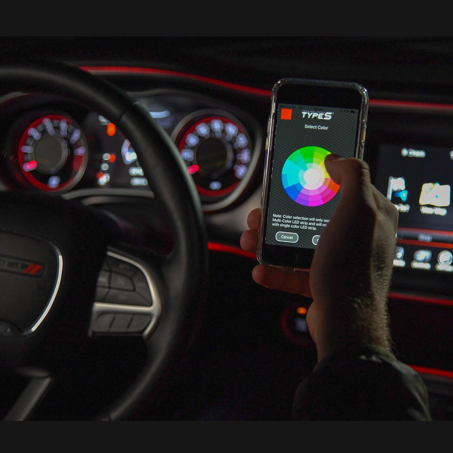 With our free type s led app that works with most iphone and android devices you can customize 4 different zones of led lighting in your vehicle using 49 different colors and 8 effect modes.